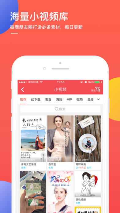 -拥有丰富的微商视频模板,招商模板、节日模板、早晚安模板、热点事件模板。-海量的微商视频素材,一键保存素材和分享至朋友圈,打造朋友圈必备。