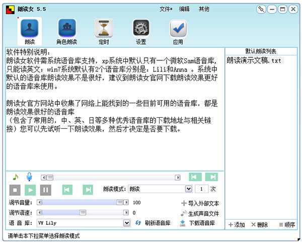 很多语音朗读软件都是没有自带语音库的,所以您在安装好朗读软件后,还必须另外下载安装语音库才能够正常使用朗读软件来朗读文本。