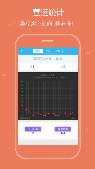 微店强大的运营统计功能,让您清楚掌握客流动向,洞悉客户关注热点,精准定位赚大钱!