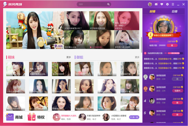 暴风秀场直播间是一款美女如云的电脑直播软件,该软件聚集了女神、萌妹、御姐、萝莉等各类高颜值美女主播,你可以随时随地与主播互动沟通,还可以查看她们的朋友圈,了解她们的私生活。