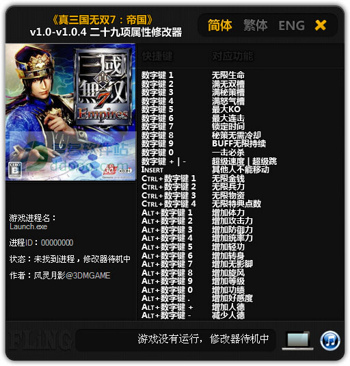 真三国无双7帝国修改器是专为真三国无双7帝国游戏打造的一款多功能属性修改器,具备无限生命、锁定时间、一击必杀、无限金钱以及无限兵力等29项修改功能,并内置简体、繁体和英文三种语言,可以帮助玩家更好更轻松的通关游戏。