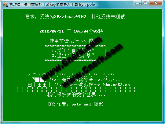 使用方法:关闭自我防护,退出卡巴,运行批处理文件即可(可以先删除卡巴原有的key)!