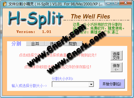 文件分割小精灵 V1.01 简体中文绿色免费版 “文件分割小精灵”是一个小巧好用的文件分割与合并工具,只有33KB大小。支持文件直接拖放。用户可以随意设定文件的分割大小,可以生成合并批处理文件,可以智能侦测A盘并自动写入,这给想把一个文件分割以便装进几块软盘的用户带来了极大的方便:整个过程只需点几下鼠标便可完成,而且真正做到充分利用软盘的空间。文件分割小精灵无需安装直接运行,是个绿色软件,推荐使用。