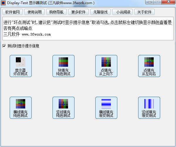 DisplayTest下载 v2.17 绿色免费版 DisplayTest是一款小巧简单的液晶显示器测试软件。该软件不仅可以免费检测用户的电脑显示器状况,还会准时提供显示器的测试信息,有需要的可以下载。功能包括显示器坏点测试、块填充纯色测试、点填充从上向下、横线填充纯色测试、竖线填充纯色测试等等测试功能。