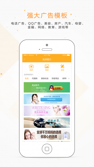 通栏链接、名片电话、公众号/二维码、图片、QQ等形式,广告形式多样,点击可转到 网站、微店等平台链接,可一键拨号、扫描二维码等
