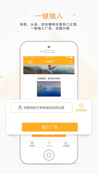【操作简单,一键植入】复制微信朋友圈或今日头条任意文章链接,粘贴到软件中,即可进行广告植入,引爆你的宣传,让广告飞起来!