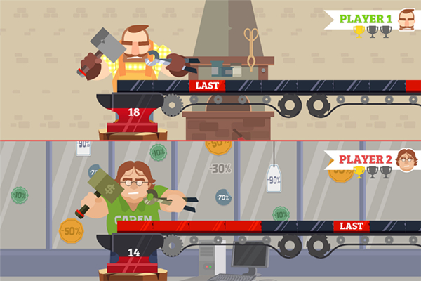 打击铁匠是一款休闲好玩的益智类游戏。工厂通过传送机将需要打压的铁器传送到玩家的下方,玩家需要短时间内快速的打压更多的铁器,数量领先对手,即可获得游戏胜利了。