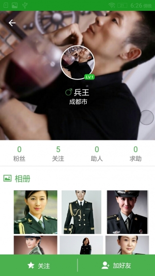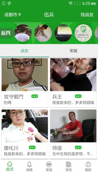 伍兵app——主要为复转军人提供线上就业创业、生活服务即:就业资讯、就业技能培训、创业资讯、创业资源对接、创业交流、政策咨询、法律咨询、生活服务(找战友、找军嫂、互帮互助)等服务。包括聊天,发表动态,发表任务,任务帮助,求助等信息。