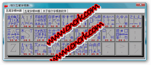 本软件完全免费使用,具有QQ的自动窗口收缩功能,方便学习五笔字型及使用五笔字型打字的人员进行字根查询,本软件包含五笔86、98两种字根表。可实现程序自启动功能。