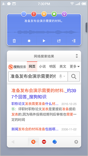 您可以长按 Home 键并开始说话,输入的语音内容将会自动转化为文字,松开即生成“胶囊”并浮在桌面上。同时能快速呼出在线内容和本机应用,联系人和音乐等。