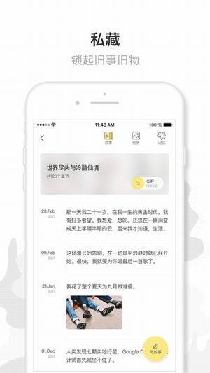 我们尊重每个人的隐私,你的档案将珍藏在私密空间中,需要手势密码才能解锁编辑和阅读。你的一切都将存储于云端保存,让你不会因设备丢失而失去这些回忆。没有你的允许,这些内容都不会被公开。