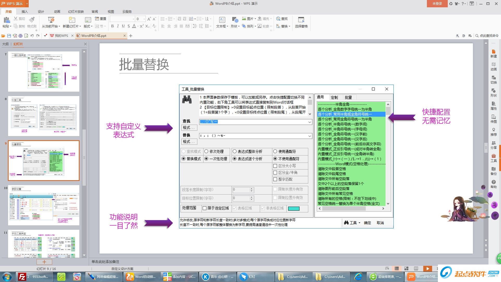 批量替换工具(多个查找替换一次性处理)、上下标自动处理工具、段落工具(反向选择,特定编号段落选择)、表格工具(全选所有表格/非表格区域)、图形工具、页眉页脚工具、目录自动生成工具、颜色工具、样式工具、公文模板自动输出、格式板及超级格式刷、Excel转CAD工具、数学函数几何曲线自动绘制等。
