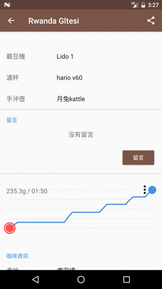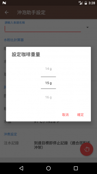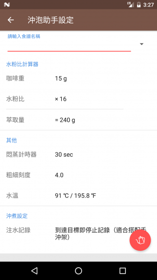 嗜咖啡提供了手冲咖啡相关数据的输入介面,让使用者能轻鬆的设定自己的冲泡食谱及数据。包含咖啡粉量、水量、磨豆粗细、闷蒸时间,还有备註栏位能输入更多额外的资讯如器材种类等等。