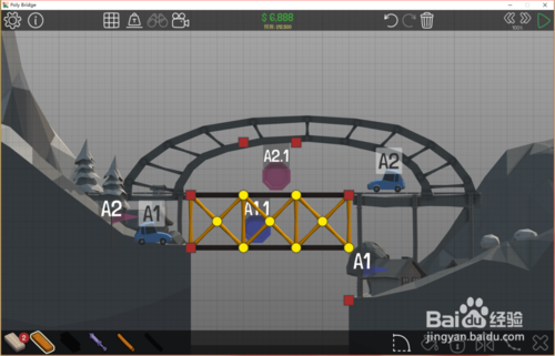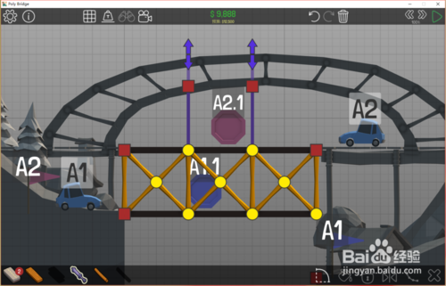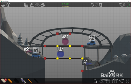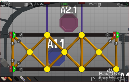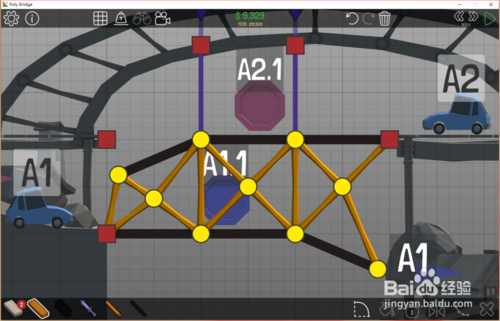 上图中,我们已经搭好路面、支撑,也建好两根液压杆,此时我们需要在中间设置分离点,我们用鼠标双击两根液压杆同时连接的中间的那个黄色的圆点,就会变成下面的样子