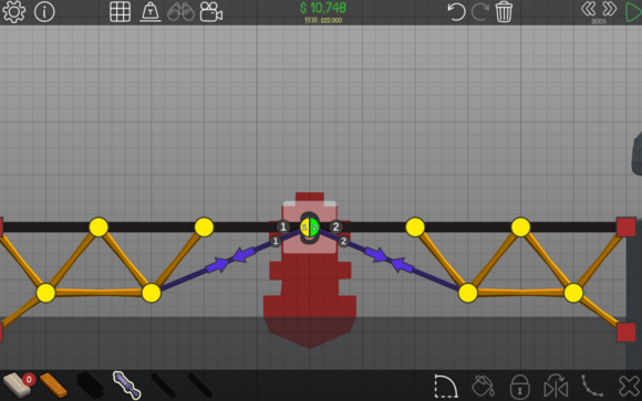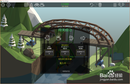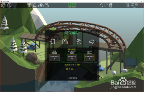 8、点击开始模拟按钮,测试通过结果如下:预算9329;压力25.7%;材料体积37.8(可以看到这次车辆顺利通过,桥梁也没有损毁,而且三项数值都是非常理想的)