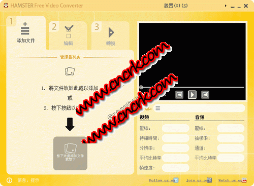 Hamster Free Video Converter(视频转换软件) V3.0.0.0 多国语言官方安装版 Hamster Free Video Converter是一个新的辉煌免费视频转换软件,变成有趣的视频转换。支持MPEG,AVI,FLV,WMV,3GP,XVID,DIVX,MKV,M2TS。你可以转换任何视频,如DVD播放器,iPod,iPhone,ipad公司,爱可视,Zune播放器,PSP的,HTC宏达电,或诺基亚视频。