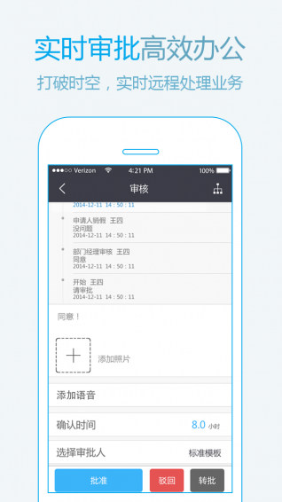 老板满世界飞,审批一拖再拖,严重耽误工作进程,移动审批,让老板随时随地审批,在线发送,及时审批。