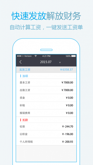 工资智能核算,让您一目了然,财务一键发送,员工手机短信或APP就即可查看工资明细,彻底告别传统工资条,让财务更省时,省力。