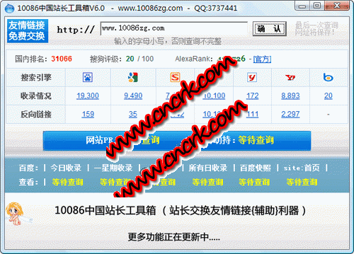 10086中国站长工具箱 V6.0 简体中文绿色免费版 10086中国站长工具箱 软件主要以站长友情链接{辅助}为目的制作的站点综合信息查询工具,主要功能是查询某个站点的Google Pagerank、Alexa世界排名、Sogou指数、中国网站排名,百度一日/一星期/一月/所有日收录/百度快照/SITE:百度首页/真假PR查询/等交换链接必须用到的功能,以及在几大主要搜索引擎中的收录反向链接的情况。官方www.10086zg.com每月更新,请及时关注.软件终身免费使用。此版本为最初版本。