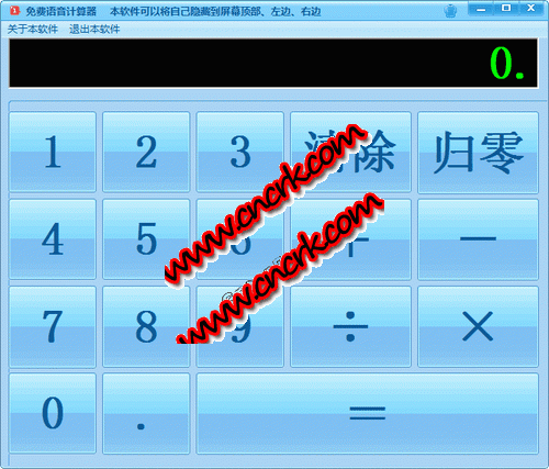 免费绿色软件,解压即可运行,无需安装!可将自己隐藏到屏幕顶部、左边、右边,采用42号字体,方便老年人使用。除了普通型计算器的所有计算功能以外,还具备了语音发声技术,让您以边听边打的方式输入数据,能够随时听到录入数据的语音,一有错误可立即得到纠正,免去了在键盘、显示器屏幕和文稿之间频繁转移视线核对数据的不便,对提高录入速度和准确性的帮助是不言而喻的。您不防试试……