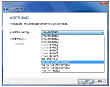 第四步:如果使用 USB 线缆连接,请选择“USB00X”,如果使用并口线缆连接,请选择“LPT1”;