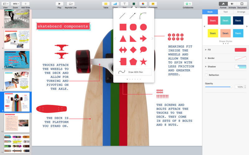 Keynote是苹果电脑CEO史蒂夫·乔布斯在为Macworld Conference and Expo和其他苹果公司的活动中主题演讲使用的演示软件,这个软件后来公开发售。与PowerPoint不同,Keynote支持几乎所有的图片字体,界面和设计也更图形化,可以用来制作更好的幻灯片。由于Keynote使用macOS内置的 Quartz等图形技术,他可以很轻易的制作幻灯片。另外,Keynote还有真三维转换,比如在切换幻灯片的时候使用旋转立方体方式。苹果公司在2005年旧金山的Macworld大会上发布了Keynote2.0和新文字处理软件Pages,这两个软件被捆绑称为iWork一起出售。不过现在还是有绝大部分用户对Keynote存在诸多疑虑。
