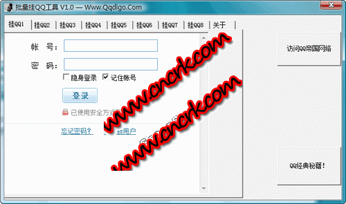 快速挂QQ小工具 V1.0 简体中文绿色免费版 本软件为一款WebQQ登陆辅助软件,通过本软件,你可以很方便地登陆WebQQ官方网站。您可以借用本软件进行QQ挂机、晒号、挂改密码等操作。软件最多支持8个QQ同时挂机。