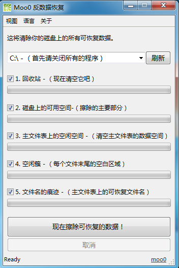 Moo0 Anti Recovery下载 V1.11 绿色免费版 Moo0 Anti Recovery是小编非常喜欢的一款数据恢复工具,软件可以一键恢复回收站、磁盘可用空间、主文件表上的空闲空间、文件名痕迹以及空闲促上的文件及信息。而且保证数据的安全不被泄漏,非常实用,欢迎下载。