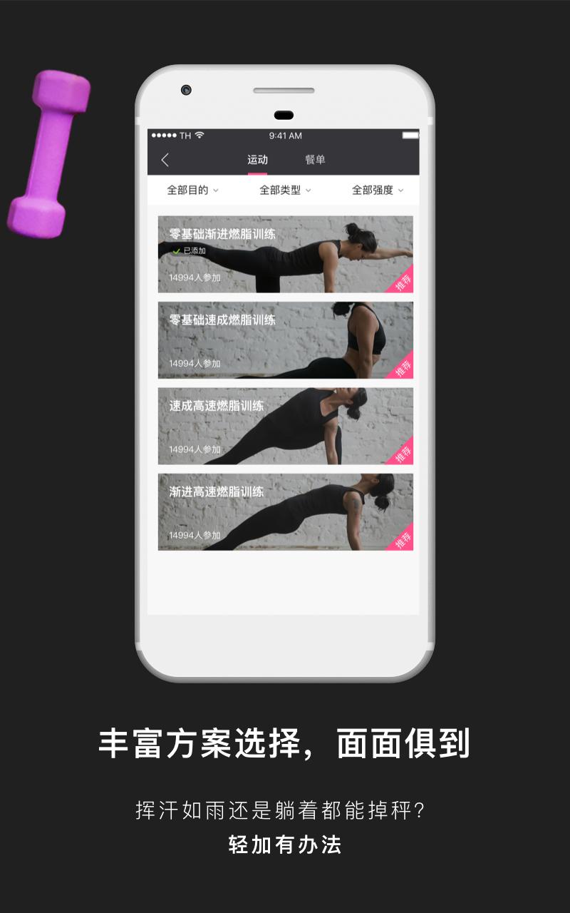 【定制化瘦身方案】运动视频、减肥餐单,多种运动和饮食方案,自由安排适合自己的减肥计划。