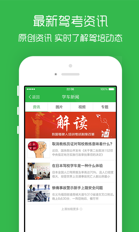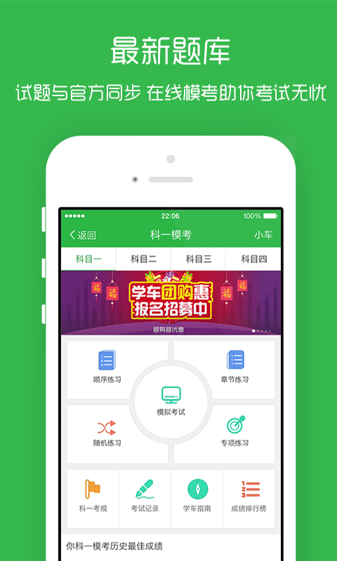 1、学车团购--精选推荐优秀驾校与教练、学车团购帮你省学费;2、新版题库--科目一、科目四题库与官方同步,在线练题助你驾考无忧;