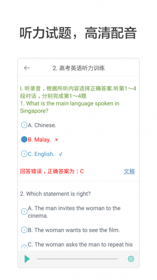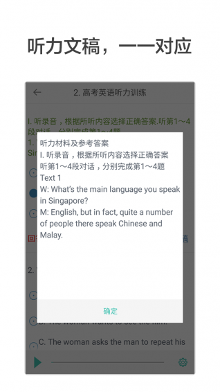 专门针对高考英语听力的训练、模拟和真题。每套听力试题都有高清的配音,听力文稿和答案也一一对应,随时查看。所有试题都针对手机屏幕进行了精心的排版,听题答题更舒适。