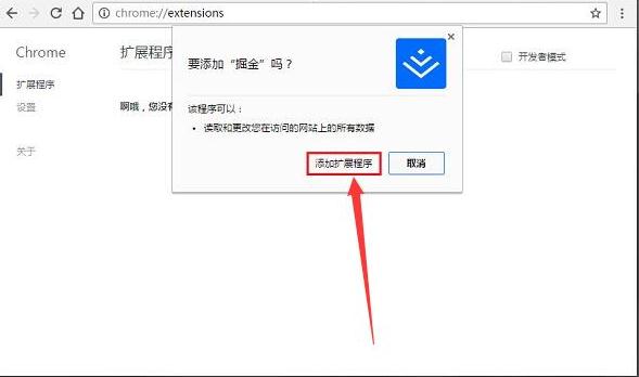 4.松开鼠标就可以把当前正在拖动的插件安装到谷歌浏览器中去,但是谷歌考虑用户的安全隐私,在用户松开鼠标后还会给予用户一个确认安装的提示。
