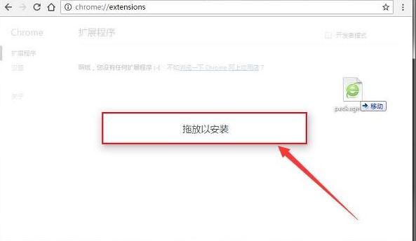 3.找到自己已经下载好的Chrome离线安装文件xxx.crx,然后将其从资源管理器中拖动到Chrome的扩展管理界面中,这时候用户会发现在扩展管理器的中央部分中会多出一个”拖动以安装“的插件按钮。