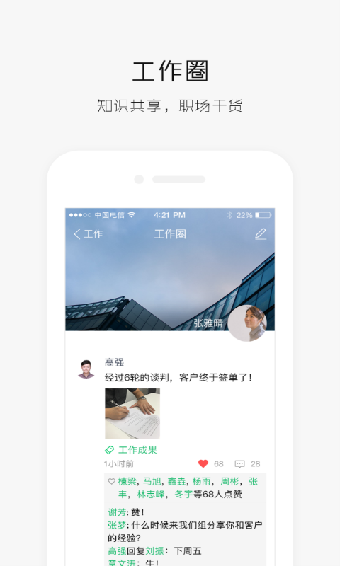 【工作圈】企业内分享观点、知识,掌握职场干货;更有点赞、评论,打造激情团队。