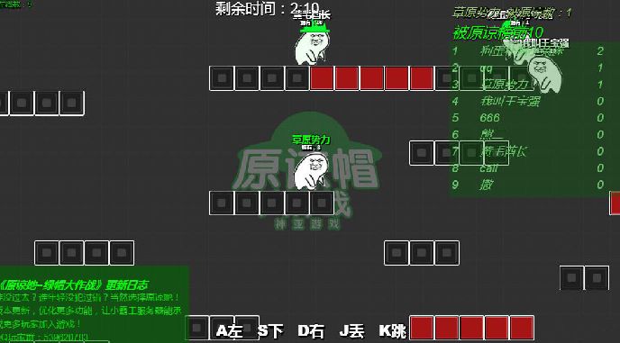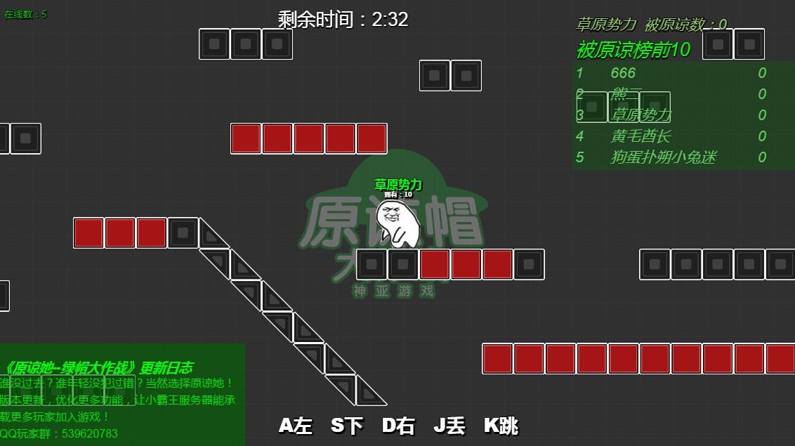 游戏的玩法和操作都非常简单,只需要在各个平台间跳跃,捡起地上的绿帽子仍在对手的头上,通过“WASD”来控制方向,然后按“J”丢帽子,“K”键跳跃。玩家持有的绿帽子数量有限,扔一个少一个,但可以通过捡地上的帽子来补充“弹药”。此外,抛出的绿帽子都会以抛物线的方式下坠,控制好距离和高度非常重要,不然就非常容易“绿人不成反被绿”。