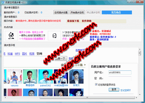 简单易用的百度空间漫步者是一款百度网空间软件,在随机访问百度网用户空间的同时可以自动添加关注。长时间使用本软件将大量的增加你百度空间的访问量,是一款宣传自己和产品必备的优秀软件。