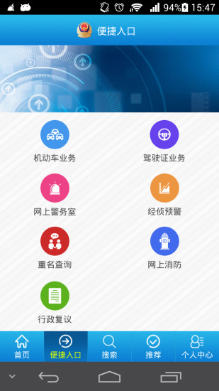 3.综合查询和办事指南模块:24小时为用户提供机动车违法、驾驶人交通违法查询、高速路况信思查询、执法办案公开查询、新生儿重名查询、生僻字查询、走失人口查询等17项服务;即时咨询153项办事指南,可定位导航引导前往最近的办事网点,并告诉市民窗口单位联系电话,服务更加便捷贴心。