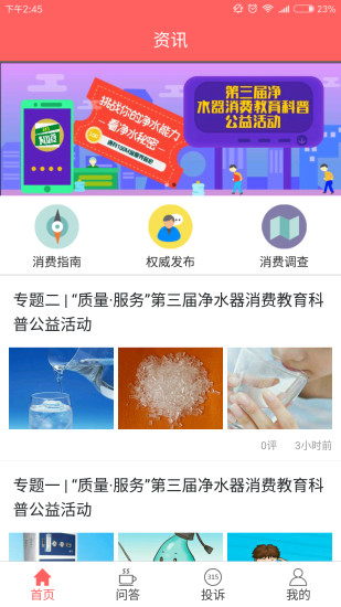 315知道是中国消费者协会主办建设的以“帮助消费者选择”为宗旨,以传播消费资讯、推动消费教育、引导科学消费、为消费者主张权益、为消费者提供咨询和投诉为主的客户端信息交互平台。【功能介绍】