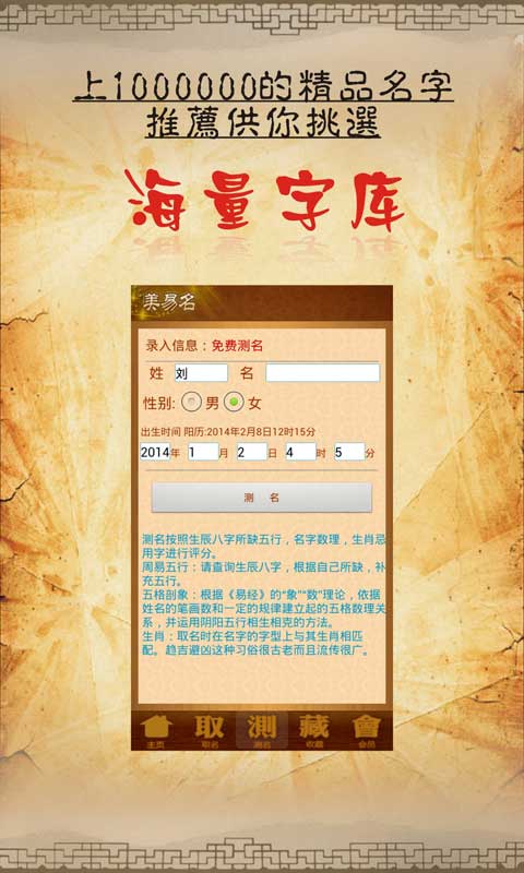 美易起名取名测名是一款不用联网宝宝起名大师软件,几乎涵盖了绝大部分主流的取名方法,传统的五行生辰八字起名、生肖、五格数理取名、周易取名法;诗词取名、典籍取名法;