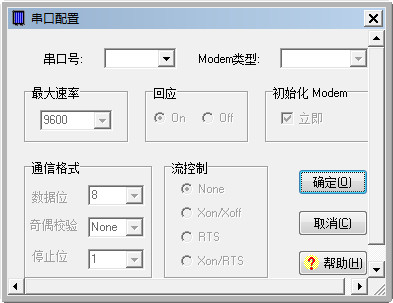 在选择了[本地RS-232联机]、[Zigbee无线联机]、[远程Modem数传联机]或、[远程Modem短信联机]类型后,系统将自动显示如下的[串口配置]窗口。