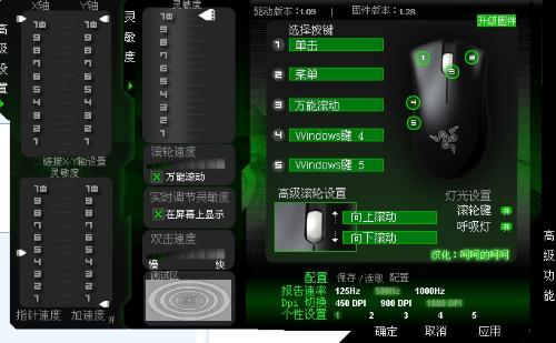 在软件的界面我们可以看到,使用了雷蛇最具有代表性的绿色和黑色。主界面上依次可以对按键的功能,HZ频率,灯的开关以及DPI和档案的设置