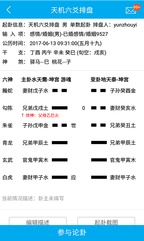 天机六爻排盘是一款为爱好者量身打造的周易六爻学习、卦例研究的综合性平台,独有的信息交互系统,让爱好者的每一句断语都能得到真实有效的反馈,不仅能通过参与悬赏、分享六爻经验获取研究经费,也能与众多易友学习解卦思路与秘诀,成就每一位爱好者的大师之路,让周易文化与学术得到科学化发展与传承。【软件功能】