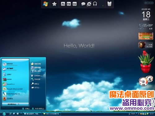 魔法桌面原创hello,world电脑桌面主题,忧郁的天空和云朵是这款主题的最大特色,虚幻缥缈的云朵溶进又深又蓝的天空,让人感觉空旷而悠远。调整好心情,大喊一声hello,world吧