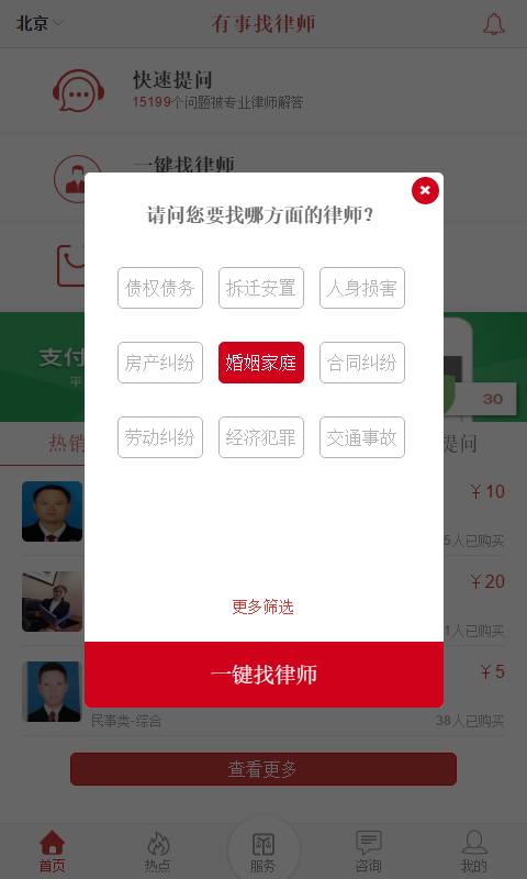 1. 【一键找律师】认证律师覆盖全国95%以上的城市,基于位置及律师大数据,一键为用户匹配合适靠谱的律师。