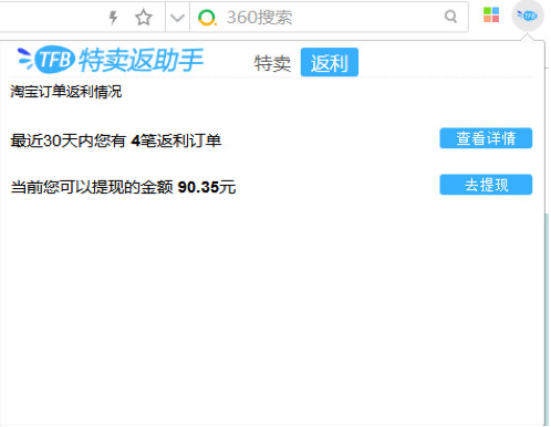 直接在浏览器右上角的扩展界面查询,点击特卖返图标即可打开扩展界面,就可以查看到有多少成功的返利订单咯,如果需要查看详情页,需要点击“查看详情”就可以打开阿里妈妈,查看到详细的订单信息了。