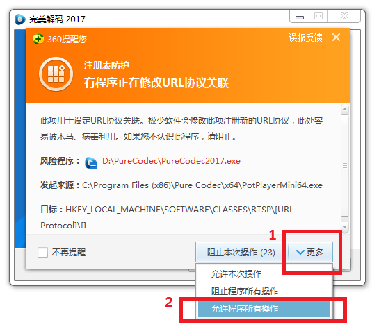 1、如果你选择了“关联多媒体文件”,防病毒软件可能会拦截,以360安全卫士为例,被拦截时要如下图选 “更多”-〉“允许程序所有操作”