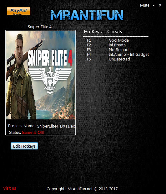 狙击精英4六项修改器[MrAntiFun] v1.52 免费版 狙击精英4六项修改器是专为《狙击精英4》游戏玩家们所准备的游戏修改工具。该工具拥有上帝模式、锁定心率、无需装弹等多项功能,有需要的玩家千万不要错过。