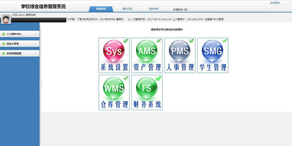 本系统旨在为在学校信息部门工作的同仁提供一个管理方便、实用、免费的管理系统。本系统在使用上不做任何功能限制,使用者可放心使用。本系统包含了丰富的管理模块,比如仓库管理,人事管理,学生管理,财务管理,学生学费管理,学生生活费管理,课程管理,校车及乘座管理等。使用中如有问题可与作者联系