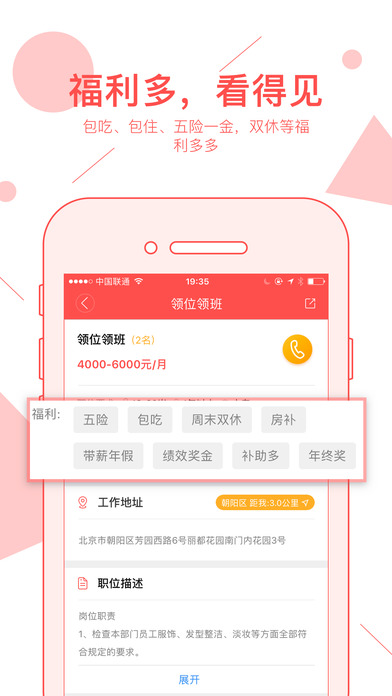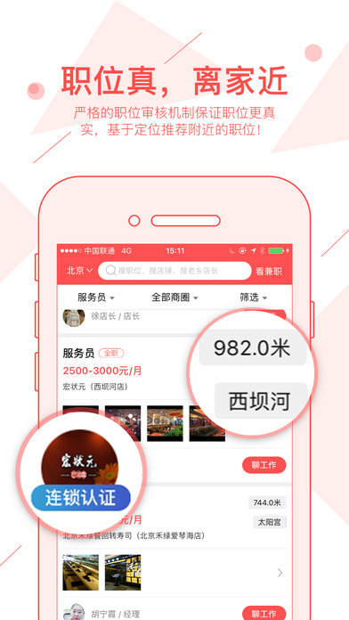 【】是一款专门针对服务业免费招聘/找工作的手机软件,根据定位精确匹配附近的好工作和求职者,获得对方联系方式更快捷,在线聊工作,发面试,入职招人更高效!【职位真,离家近】严格的职位审核机制保证职位更真实,基于定位推荐附近的职位!