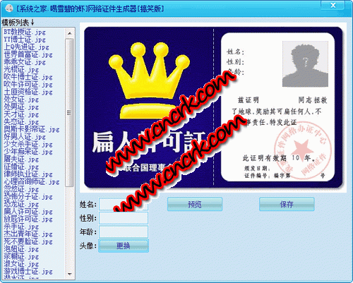 使用方法不必多说了,界面很简洁。软件自带51个网络证件模板,都是灰常灰常搞笑滴…… 软件必须解压后运行,否则检测不到模板。要添加模板的话,可以在软件的“模板”文件夹中添加文件,软件会自动检测